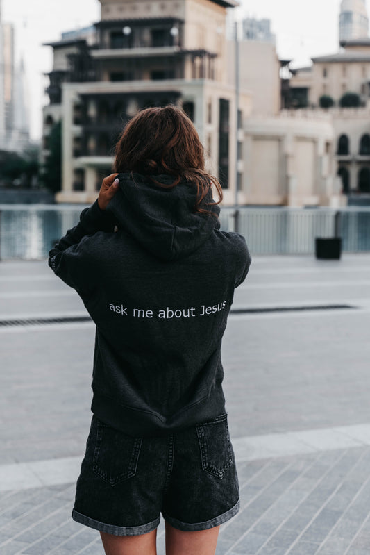 " ASK ME ABOUT JESUS " Women's Charcoal Grey Hoodie