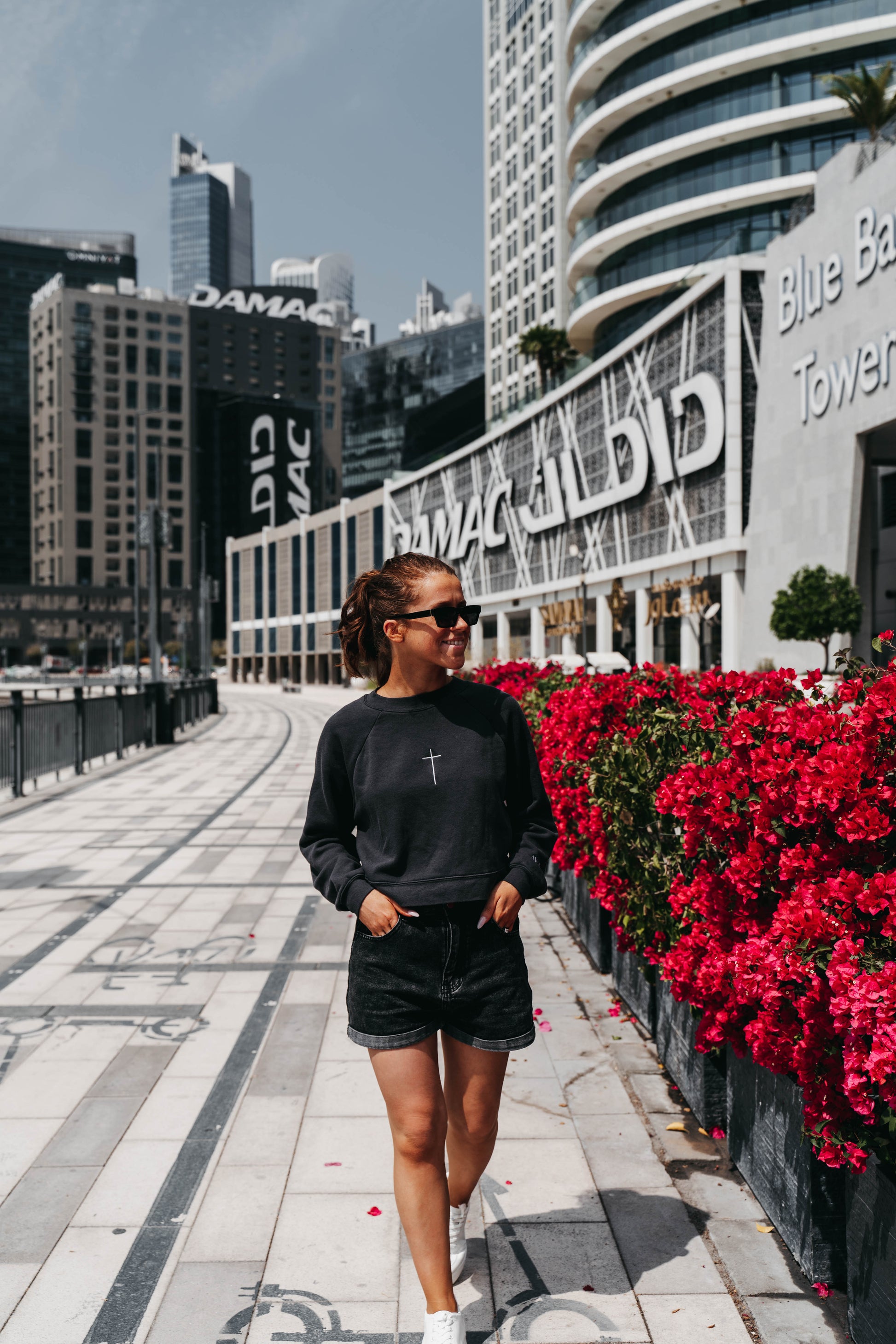 this crewneck is a cropped fit, so we recommend sizing up for a more relaxed look.