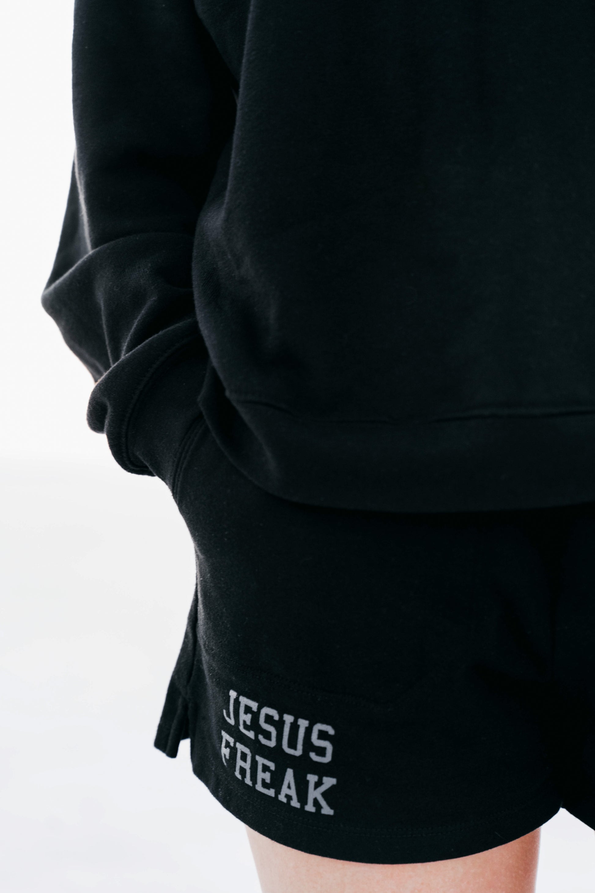 Introducing our dynamic 2-piece lounge set, designed to celebrate your bold faith and unwavering devotion. the centerpiece of this set is a cozy crewneck adorned with the spirited declaration 'JESUS FREAK' proudly displayed across the front. paired with matching shorts featuring the same empowering message, this ensemble is perfect for moments of relaxation and reflection. crafted from premium materials for maximum comfort and durability, this set embodies both style and spirituality. wear it with pride as a testament to your unapologetic love for Christ, whether lounging at home or making a statement out and about.