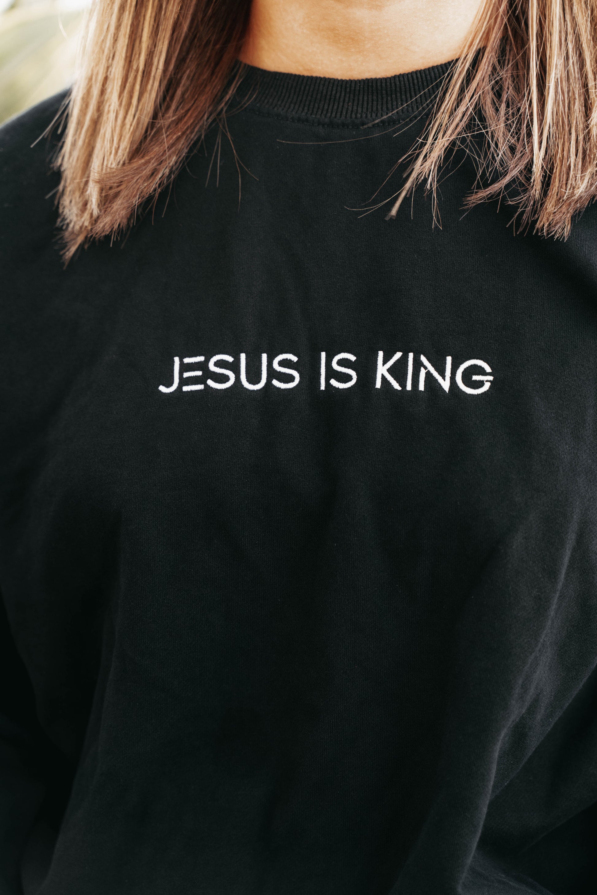 wrap yourself in faith and comfort with our women's long sleeve loose shirt in a solid, serene hue. crafted for ultimate coziness and style, this shirt features the timeless phrase 'JESUS IS KING' delicately embroidered across the chest. available in various sizes, our model is wearing a size small in the photos!