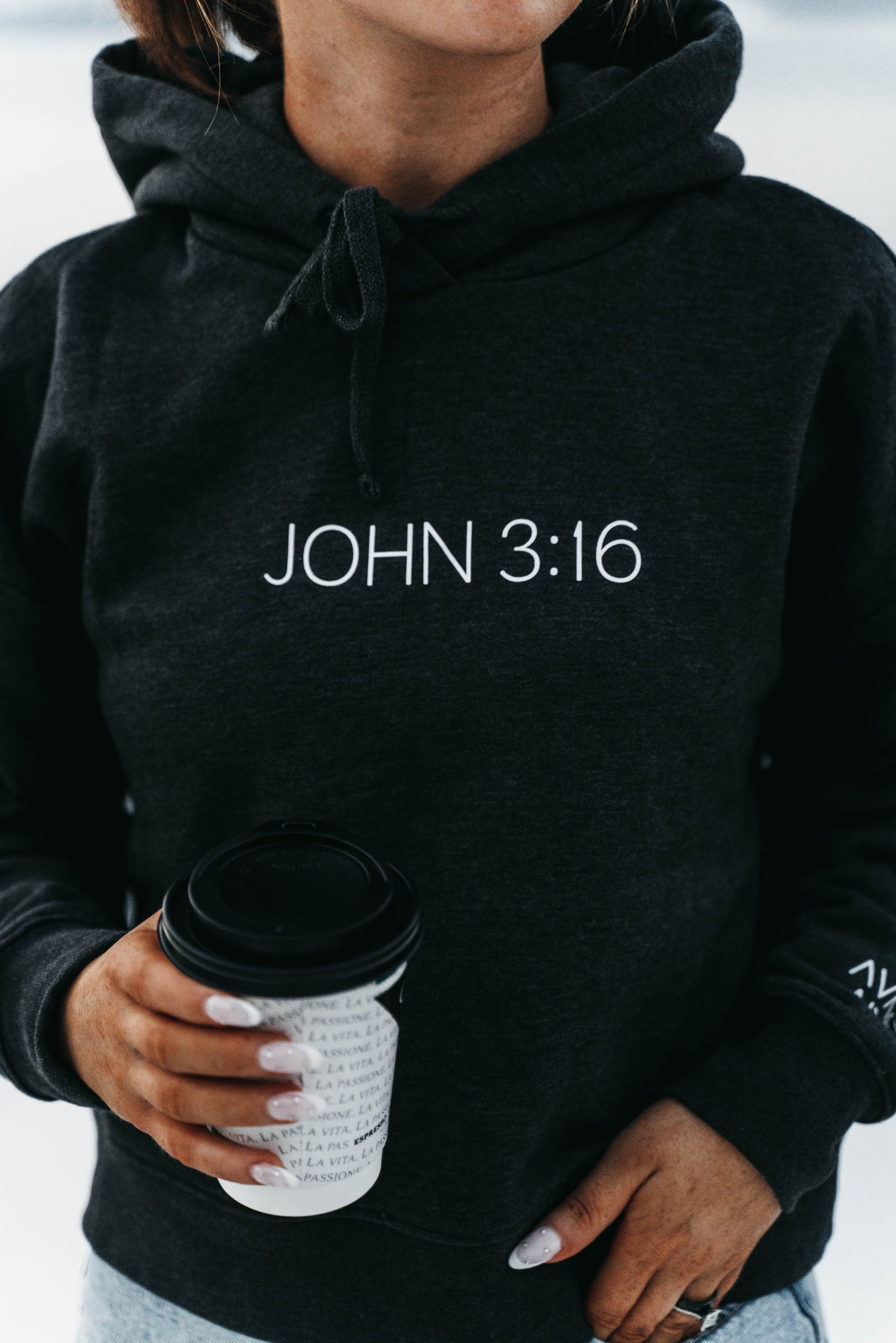 elevate your casual wardrobe with our impactful hoodie, featuring the iconic phrase 'JOHN 3:16' boldly printed on the front. turn heads and spread the message of love and salvation with this powerful statement of faith. on the back, the hoodie showcases the full Bible verse, ensuring that the timeless words are always close to your heart. crafted from premium materials for comfort and durability, this hoodie is perfect for everyday wear, whether you're running errands or attending gatherings. stay warm, stylish, and spiritually connected with our JOHN 3:16 hoodie.