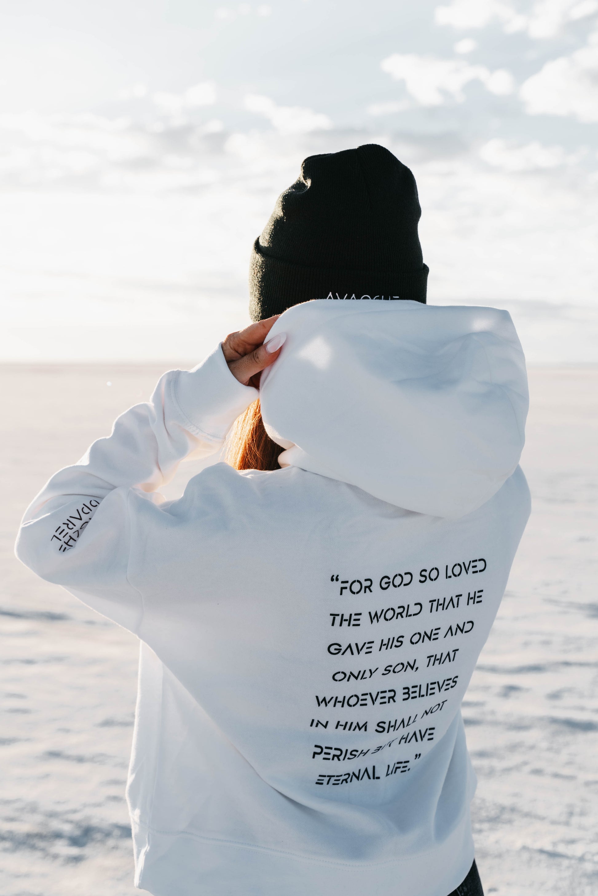 elevate your casual wardrobe with our impactful hoodie, featuring the iconic phrase 'JOHN 3:16' boldly printed on the front. turn heads and spread the message of love and salvation with this powerful statement of faith. on the back, the hoodie showcases the full Bible verse, ensuring that the timeless words are always close to your heart. crafted from premium materials for comfort and durability, this hoodie is perfect for everyday wear, whether you're running errands or attending gatherings. stay warm, stylish, and spiritually connected with our JOHN 3:16 hoodie.