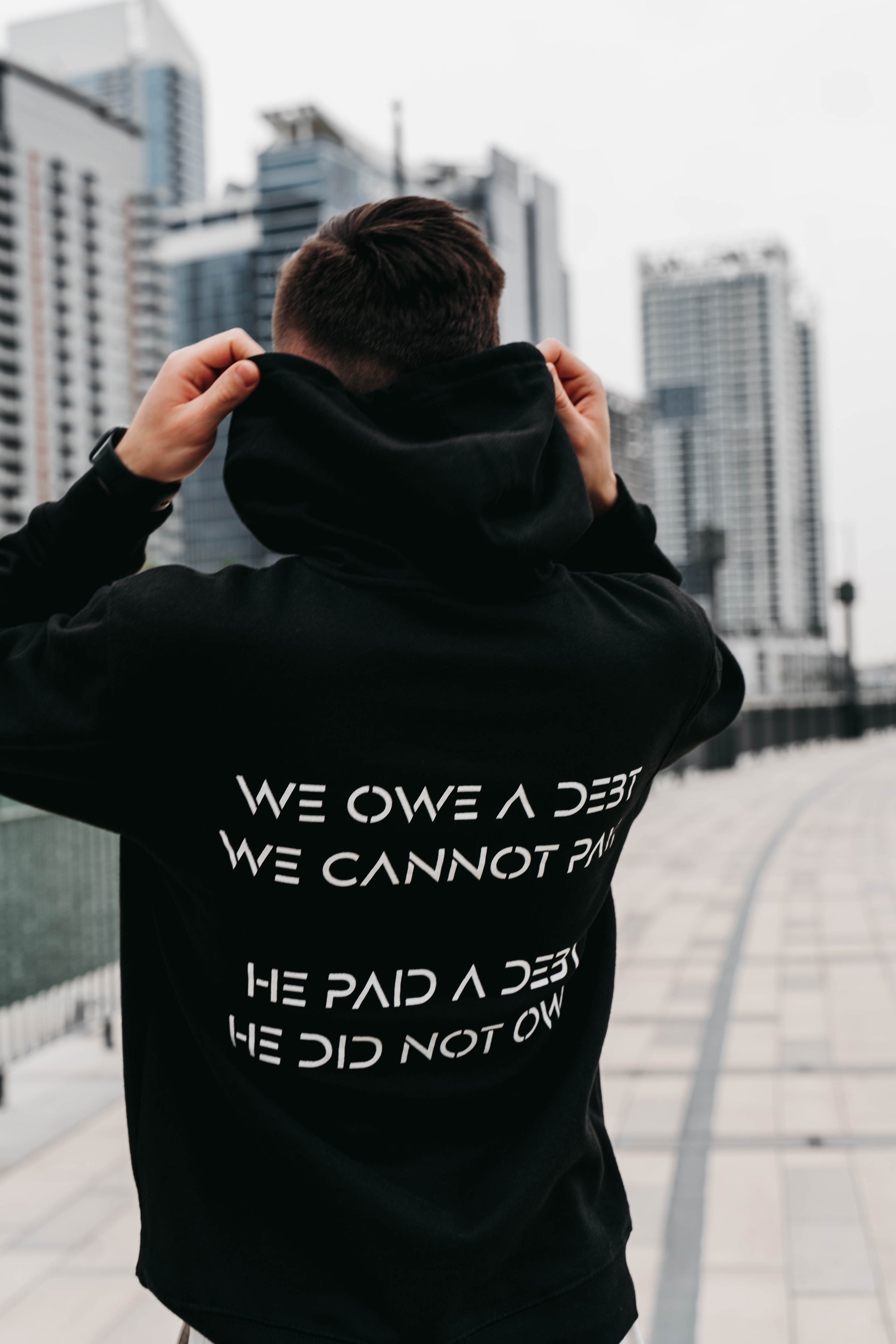 embrace the profound message of grace and redemption with our impactful hoodie. on the front, a beautifully rendered cross serves as a striking symbol of faith and salvation. crafted with attention to detail and comfort in mind, this hoodie is perfect for everyday wear, whether you're out and about or relaxing at home. turn heads and inspire reflection as you wear your beliefs boldly. on the back, the poignant phrase 'WE OWE A DEBT WE CANNOT PAY, HE PAID A DEBT HE DID NOT OWE' is prominently displayed, reminding us of the sacrificial love of Christ. with its powerful combination of visual imagery and profound words, this hoodie serves as a powerful testament to the transformative power of faith. stay warm, stylish, and spiritually uplifted with our captivating hoodie.